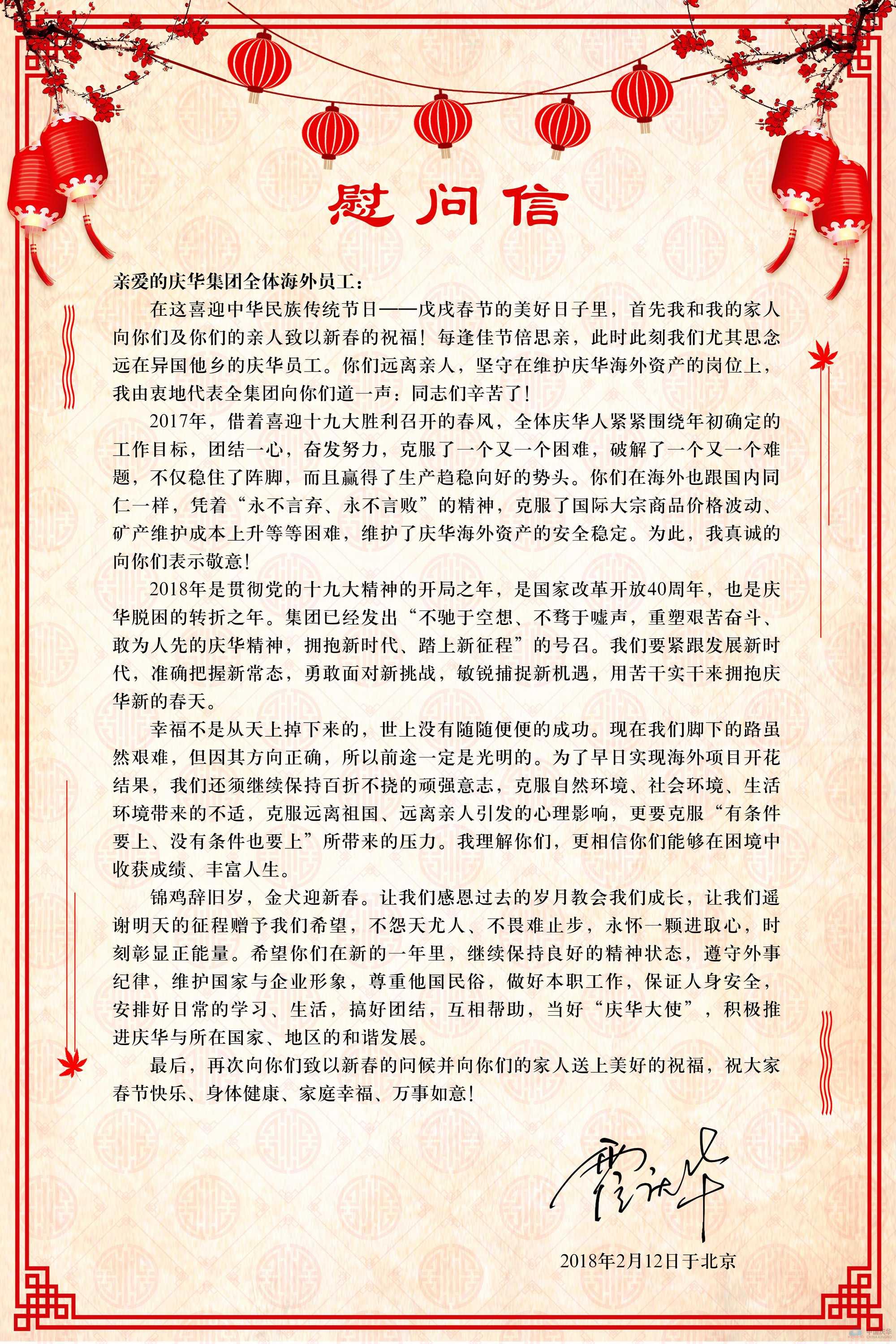 董事長給慶華集團全體海外員工的新年慰問信