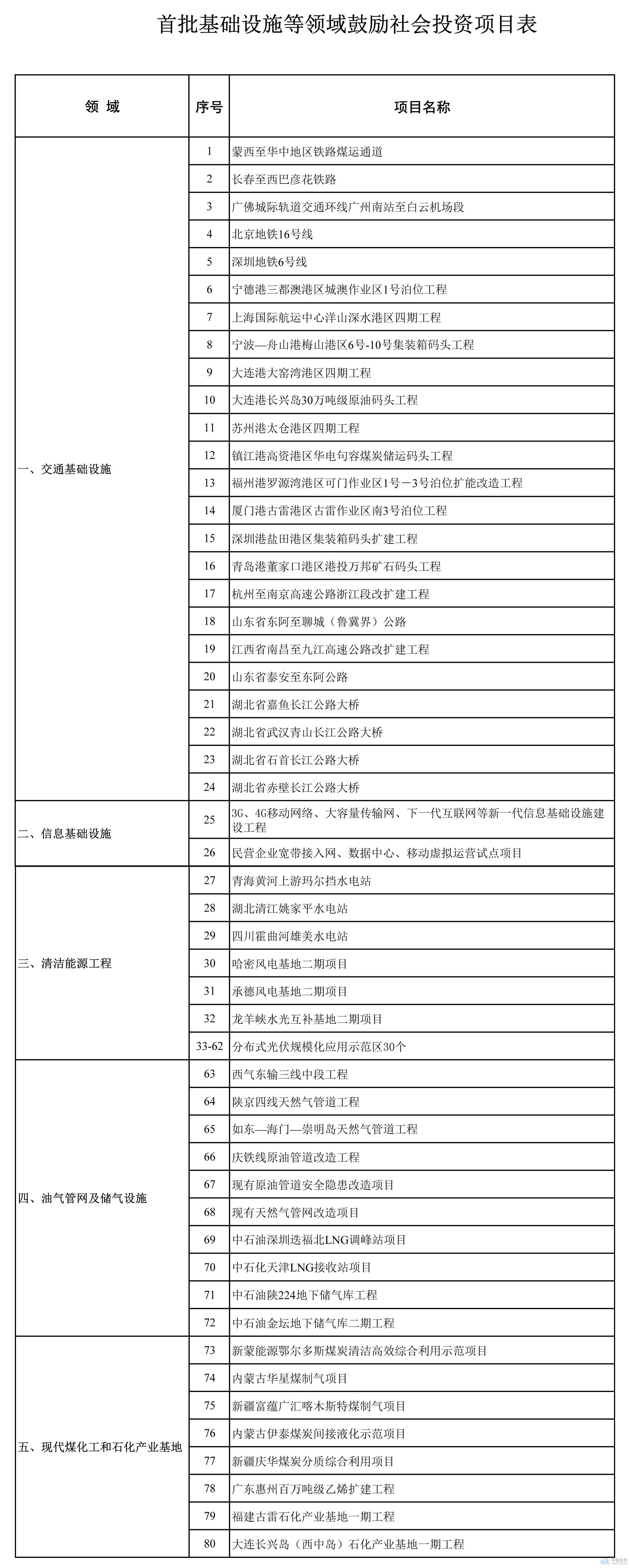 一、首批推出的基礎(chǔ)設(shè)施等領(lǐng)域鼓勵(lì)社會(huì)資本參與的80個(gè)項(xiàng)目涵蓋鐵路、公路、港口等交通基礎(chǔ)設(shè)施,新一代信息基礎(chǔ)設(shè)施,重大水電、風(fēng)電、光伏發(fā)電等清潔能源工程,油氣管網(wǎng)及儲(chǔ)氣設(shè)施,現(xiàn)代煤化工和石化產(chǎn)業(yè)基地等方面,鼓勵(lì)和吸引社會(huì)資本特別是民間投資以合資、獨(dú)資、特許經(jīng)營等方式參與建設(shè)及營運(yùn)。